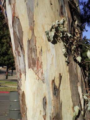 I agree that the tree trunk photographed is part of an Australian gum tree. I know there are Australian gum trees nowadays growing in places like California. Not sure about the origin of the trumpet flower but one of my neighbors has them in her front yard. Personally I think they look more like a plant’s interpretation of a bird of paradise than a trumpet.