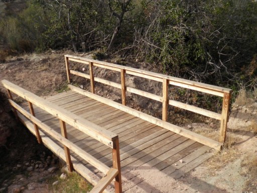 across a small wooden bridge,