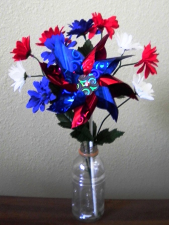 Since my life continues to be traumatic and chaotic, a friend suggested I do something nice for myself. My car is in the shop, which is part of the chaos — my father is going through a medical crisis, and my not having a car only adds to the stress. Without a vehicle, I am pretty much stuck with what is in my immediate environs for that something nice. So I spent a few relaxing moments putting together a fake flower arrangement. It gave me my first smile in several days, so apparently it’s working. Hope it brings a smile to your life, too.