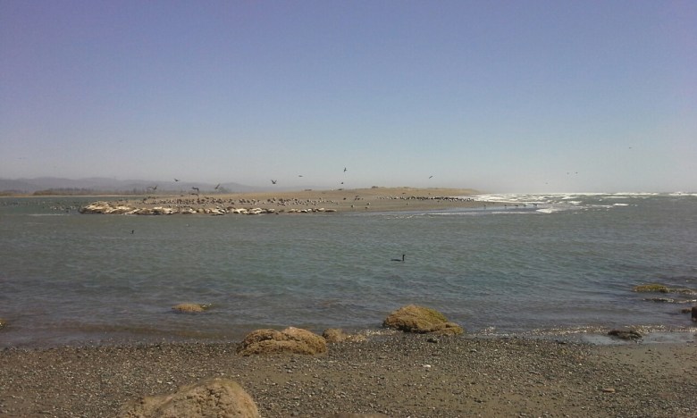 I sat on the rock, feeling the scene. The waves creeping up to my feet, then scurrying away as if they had done something daring. The ocean breezes playing with my hair. The surf demanding to be heard. The only creatures — if you don’t count me, and how can you since I was a rock — were the seals, pelicans, gulls, and cormorants sunning themselves on a bit of land. (The things that look like sandbags on the edge of the island are seals. The birds in the air are pelicans.)