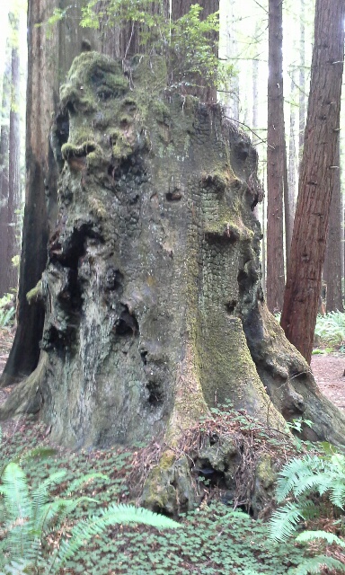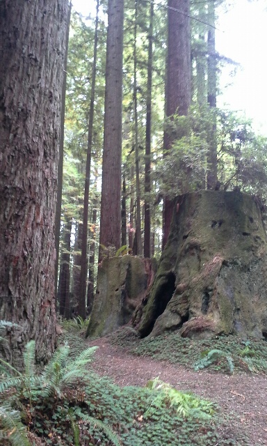 For some reason known only to my phone, the photos I took came out bright and cheery, and give only a hint of how creepy the place was. Not only was the forest dense, dark, and dank, ghosts of an unimaginably ancient forest remained where redwoods had been felled. New trees grew out of the old. Fire and time carved caves in the massive stumps. And mold colored them green.