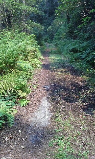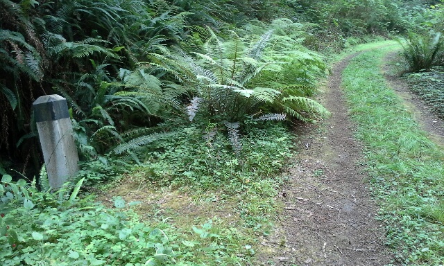 Yesterday I headed out on a 7.2 mile hike, starting on what was called The Damnation Creek Trail. After about three-fourths of a mile I took a turn onto the Coastal Trail. This section of the Coastal Trail lay inland on what was the original Redwood Highway. The highway had been built in the 1920s and abandoned in 1935 because of the difficulty in maintaining it — it kept crumbing and was beset with rockslides. (Ironically, on the drive to the trail head, my friend talked about recent discussions to move the current road further inland because it too is crumbling.) In spots, the pavement with the white center line showed through, and even a few of the original mile markers remained.