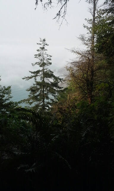 In spots, the road all but disappeared, leaving a narrow trail crossed with fallen trees or buried under rock, but those places were quickly navigated. Somewhere along the way, the old highway disappeared altogether. I think it was right after the viewpoint where I stopped to take a photo of the bay far below. (In the photo, the ocean is barely visible beneath the fog. In fact, from that point forward, my journey was accompanied by the lonesome call of the foghorn.)