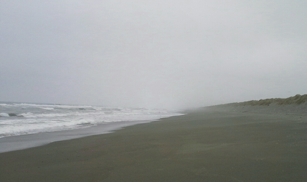 I went for a three-hour beach walk yesterday. It was perfect timing, with low tide at the mid point of my hike so I mostly had hard wet sand to walk on. It was also a perfect ocean day, cloudy and foggy, and so cool I needed to wear a windbreaker and a scarf around my neck.