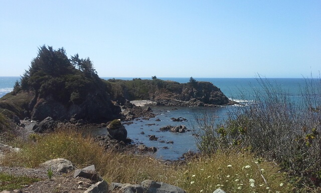 My hostess had business in Oregon, so I drove up the coast with her, and she dropped me off in town. I had no plans, just thought I would see what I could see. After about a half hour of wandering, I saw a sign for Chetco Point. I followed the road, figuring anything that leads me to the point is a good route to follow. Turns out, Chetco Point State Park is a reclamation project, probably sponsored by the bordering waste treatment plant. There was a lovely little picnic area with a view of the ocean and a large sea stack (a remnant of an ancient coast line, too hard to wash away with the softer and sandier part of that old shore).