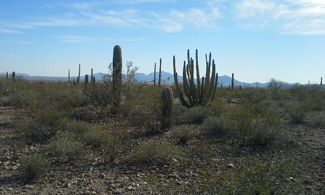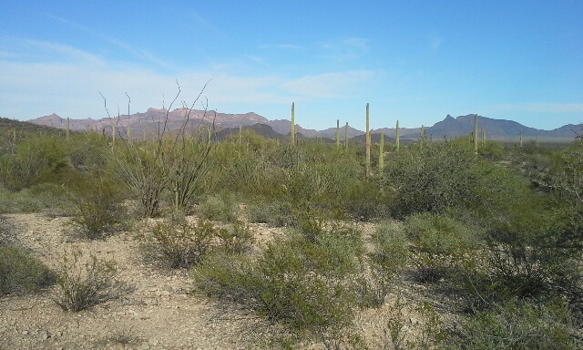 In the middle of a long stretch of empty desert highway (perhaps fifty miles along the Barry Goldwater Air Force Range), I saw a not-young woman walking. She was pushing the sort of cart that people who hike across the country use (because no one can carry all the necessary water for desert stretches) so I pulled off to the side of the road, which spooked her because she stopped and made as if to head away from me. I held up my hands in the surrender position, so she stopped and let me get close enough to ask if she needed water. Poor woman wasn’t wearing a hat and was bright red from the sun. I asked where she was going, and she replied, “Asia.” It took me a minute to realize she meant Ajo. I tried to put myself in her shoes. If I were doing a long highway hike in the desert sun, would I have been wary if someone stopped to see if I needed help? Perhaps. But that doesn’t matter. She so obviously wanted nothing to do with me, so I got in my car and headed down the road to my planned destination for the next couple of days, Organ Pipe Cactus National Monument.