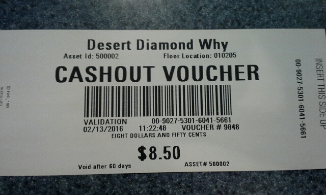 I asked if there was a quarter machine, and he ushered me to a bewildering device that only took dollar bills, no coins. He showed me where to put the bill, explained that I could play one quarter at a time, or all four at once. Since I only wanted to push the button once for luck, I opted for the four-in-one chance to win. I pushed the button, and the machine lit up and made some jingly noises. I asked Fisher what that meant, and he said I’d won 34 quarters. I waited for the thrill of all those quarters cascading into my hands, but after a few seconds, the machine pinged, and spit out a voucher for $8.50. Quite an anticlimax, but see? Lucky!