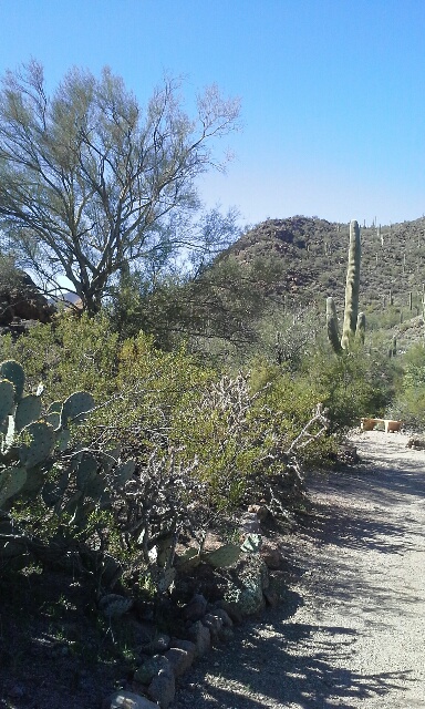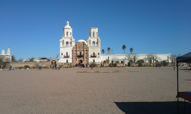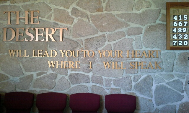 I proceeded to Tucson to meet up with a once-long-lost friend. We had a lovely dinner Saturday night, then yesterday she took me on a tour of some of her favorite places. First we visited the Mission San Xavier del Bac, nicknamed the “white dove of the desert,” because of its shining presence in the arid expanse. (The west tower was struck by lightning in 1939, and restoration continues when funds allow.) Then we drove through Saguaro National Park, and on the way back, we stopped at the Redemptorist Renewal Center on Picture Rocks Road.