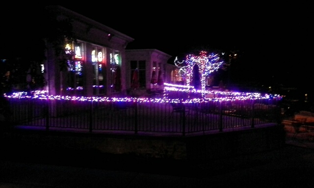 The photo of lighted trees is the night view beside my hotel balcony. The photo of the patio with a bridge in the background is the daytime view from my balcony.