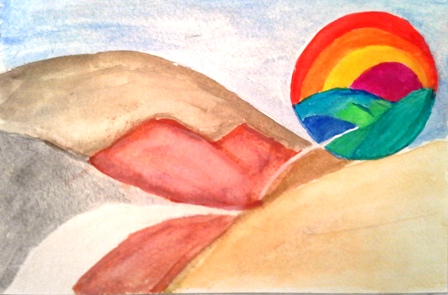 On a more positive note, I have enough toys to keep me busy for now so that I’m not falling back into grief mode. The Dragon speech recognition software, of course, is wonderful, and I have been enjoying splashing watercolors onto paper. Oddly, if two paintings could be considered a representative sample, I paint hope, which gives me hope for the future. (Is that redundant? Isn’t hope always for the future? As far as I know, there can be no hope for the past or even the present because the present is a done deal.) The picture that accompanies this post is my latest creative play endeavor.