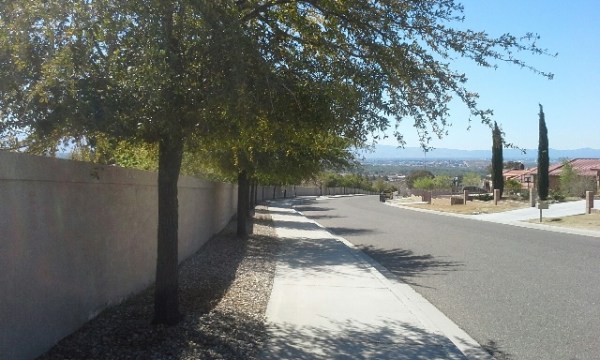 Although I have not yet learned to ignore the wails of the passing trains at night (during the day, the wind blows the sound away, so it’s not as much of a problem) and have not completely eradicated the smell of stale cigarette smoke from my room. I do feel that this new place is more conducive to healing than the old one. I have more privacy inside and a nicer area to walk outside. Being a creature of habit, I often take the same route — winding through the neighborhood, looping across the desert, and returning by way of the longest sidewalk I have seen since I left a city grid. That anachronistic sidewalk pleases me as much is the open space of the desert does.
