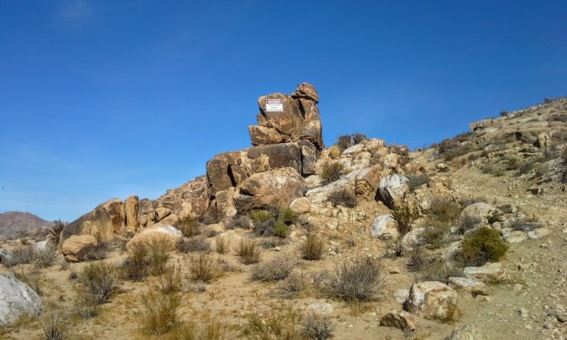Active firing range? Yikes. I knew the gun club was far below me — I’d been there a couple of times to participate in their Women on Target program, and besides, I could often hear the pop of guns when I was out roaming the desert — but I didn’t know it could be dangerous so high up. I scurried on down the path away from the sign and up to another hilltop where I had a good view of the desert across the street from where I’ve been staying. Although the knoll looks like an elongated pyramid from this view, from where I sit at the moment, it looks like a lot of rocks and jagged peaks.