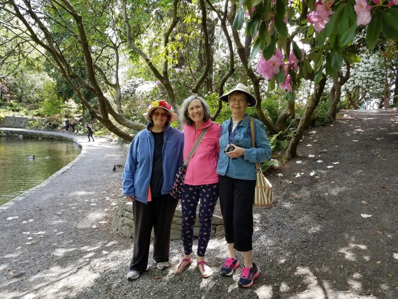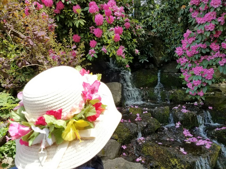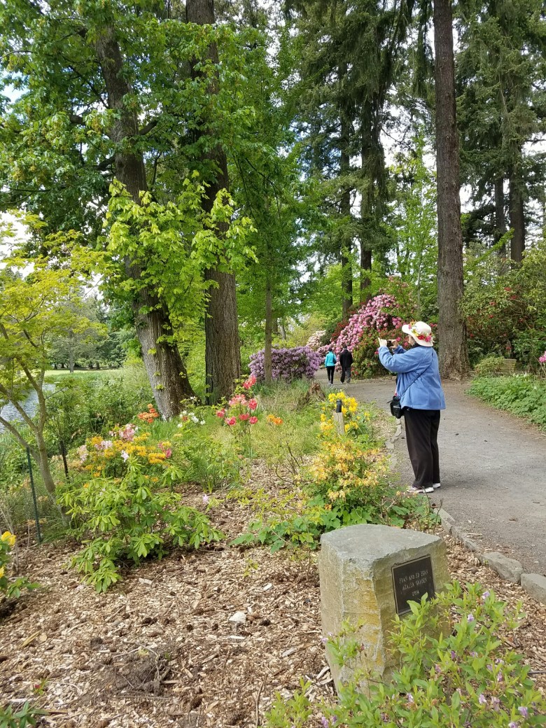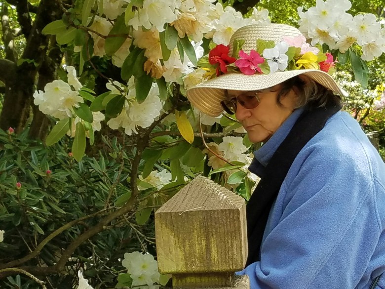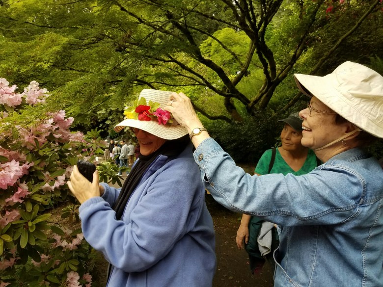 People often complain (well, once or twice anyway) that I never post photos of myself when I blog about my trips. I prefer to take more artistic photos — subject matter or groupings or whatever catches my eye, and it’s hard to catch one’s own eye. But my hostess treated me and a friend of hers (now my friend, too) to a visit to the Crystal Springs Rhododendron Gardens in Portland, Oregon, and she took some photos of us among the flowers. My favorite, of course, is the one where you can’t see me, just my hat.