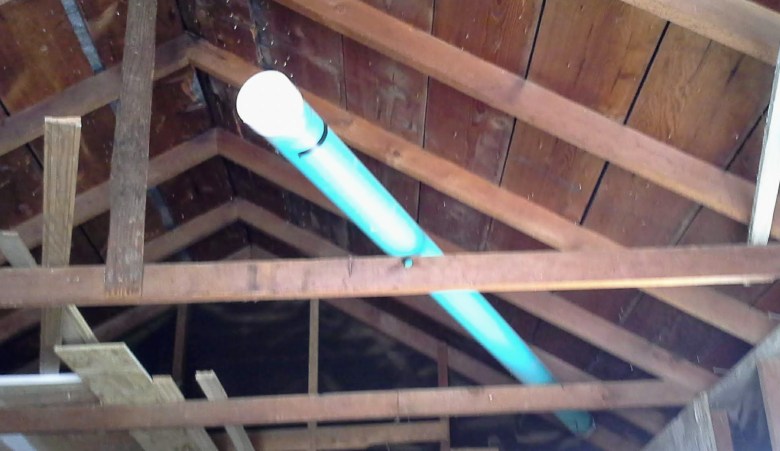 Then, as we were checking out the ceiling in the shed/garage, he pointed out a ten-foot piece of turquoise pipe stashed in the rafters.