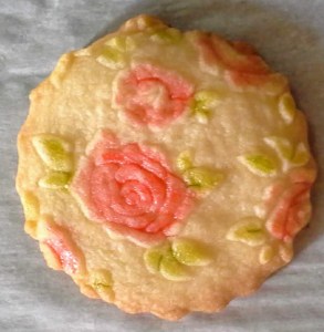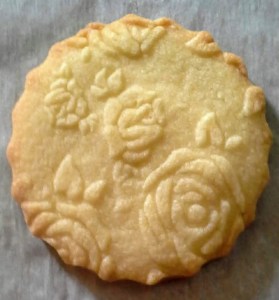 Yesterday I mentioned my woes in translating a cookie recipe from grams to cups and such to use with an embossed rolling pin, and today I decided just to wing it. My guesses as to amounts was pretty accurate, though the cookies aren’t really sweet and crisp enough, and the rose pattern does seem to thin out a bit, though I have to admit, they photograph extremely well!
