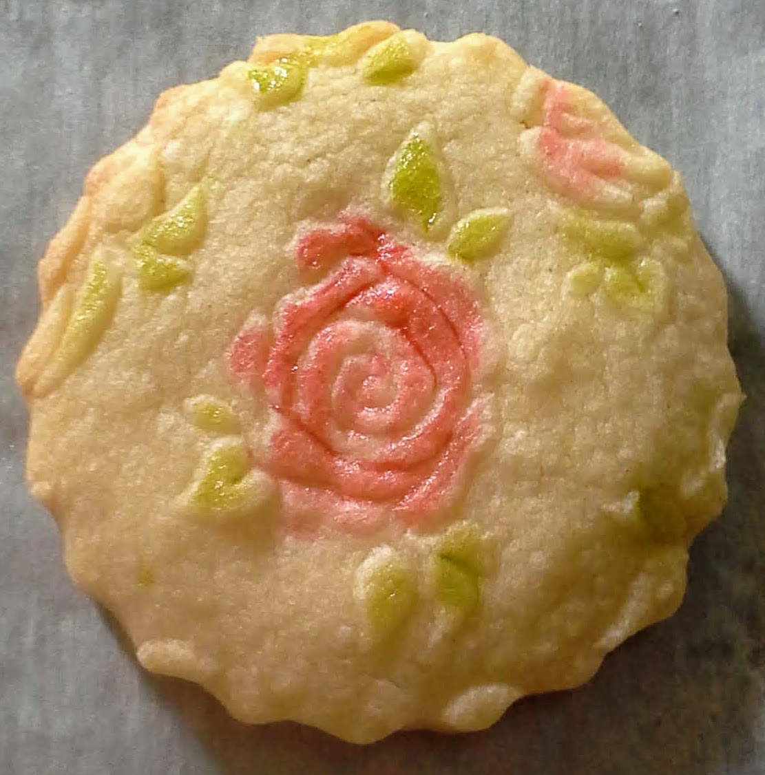 Yesterday I mentioned my woes in translating a cookie recipe from grams to cups and such to use with an embossed rolling pin, and today I decided just to wing it. My guesses as to amounts was pretty accurate, though the cookies aren’t really sweet and crisp enough, and the rose pattern does seem to thin out a bit, though I have to admit, they photograph extremely well!