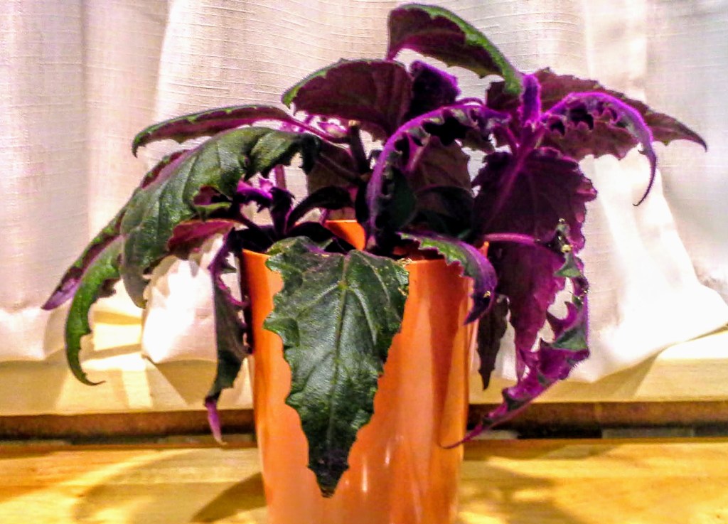 Despite my benign neglect, the plant seems to like it here. It’s in front of southern window with a light curtain that I mostly keep closed, so the purple passion plant gets plenty of diffused sunlight.