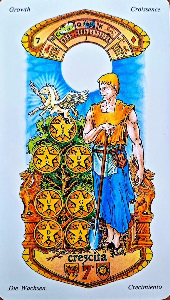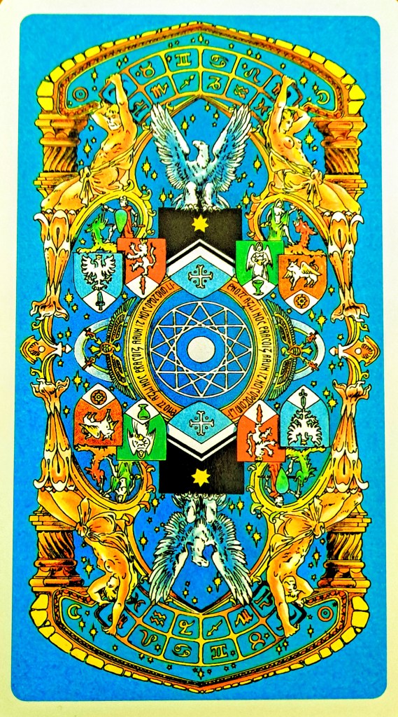 The tarot deck I am using this month is a collector’s item: La Porta Celeste — I Tarocchi delle Stelle. The Tarot of the Stars. It was one of the first in my deceased brother’s collection that caught my eye. It’s a beautiful deck, and large — 6″ X 3.5″, and seems as if it’s the sort of deck one would use to do readings. It also seems more mystical than some, since this deck supposedly has its own cabalistic and alchemical system which is unique when compared to western tarot decks. The artist, Giorgio Tavaglione, integrated copious symbolism into his designs, particularly the astronomical information illustrated above each image. The problem with this deck (and the reason I never used it before) is that the book that comes with the deck is written in an archaic Italian dialect, very difficult to translate because it is loaded with magical and alchemical double entendres.