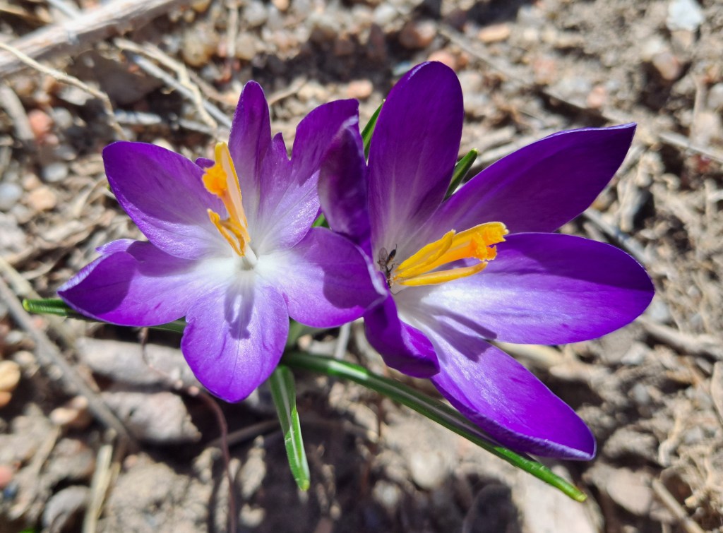 I made my rounds, checking the ground for other signs of life, and found another area where crocuses might be coming up. It’s like an Easter egg hunt, though I don’t collect the plants, I merely mark them so I don’t end up walking on them.