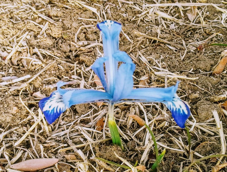 The gray day put the croci to sleep, but one more dwarf iris did find its way to the surface. A pleasant surprise in a surprisingly pleasant day.