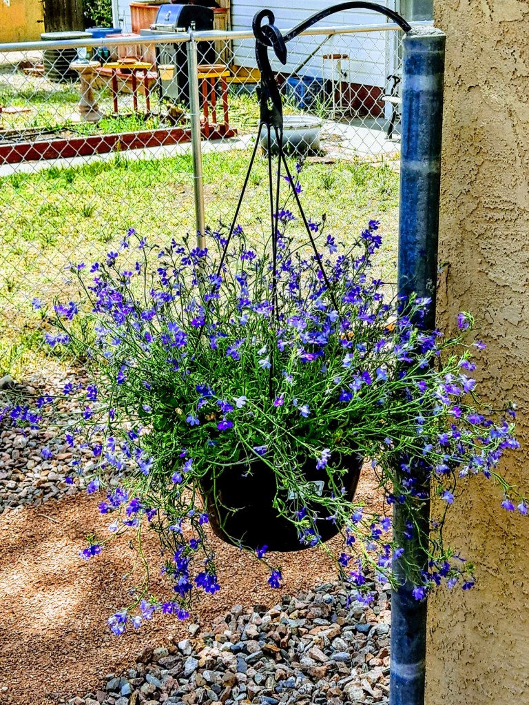 On the way back from the library, I picked up another two plants for my ever-expanding garden. I was going to say ever-growing, but too many plants haven’t started to flower or even spread. My hanging lobelia is doing fine, though.