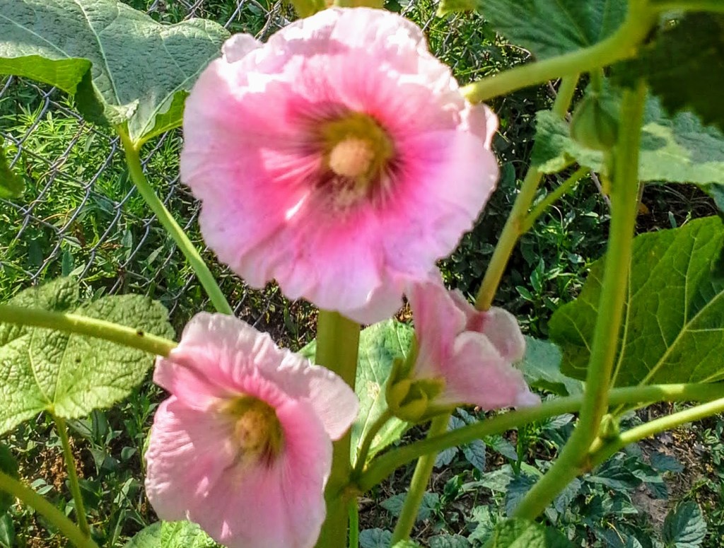 Among the plants that seem unfazed by the heat are the hollyhocks