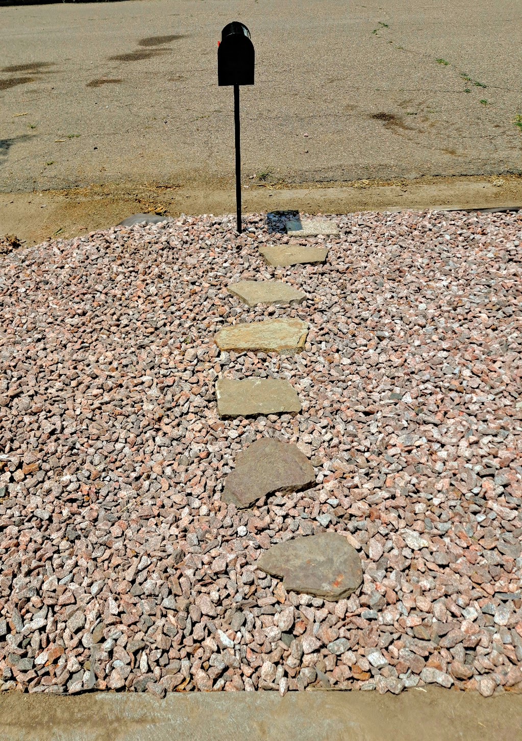 Luckily, the right of way is now landscaped with rock, but unluckily, the bed of rock is even more treacherous to cross than the weeds and mud were. Luckily, I found enough flagstones around this place to create my little pathway to the mailbox. Unluckily, I seldom get mail, but luckily, since I have to check the box anyway, I now have safe passage.