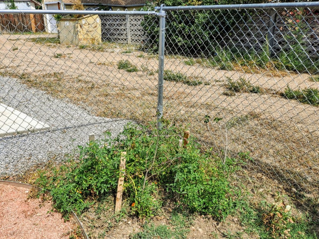 Incidentally, the lack of tall weeds — or any weeds — by the gray slag and along the other side of the fence is due to my labors at the beginning of the week where I dug up all the waist-high and shoulder-high weeds.
