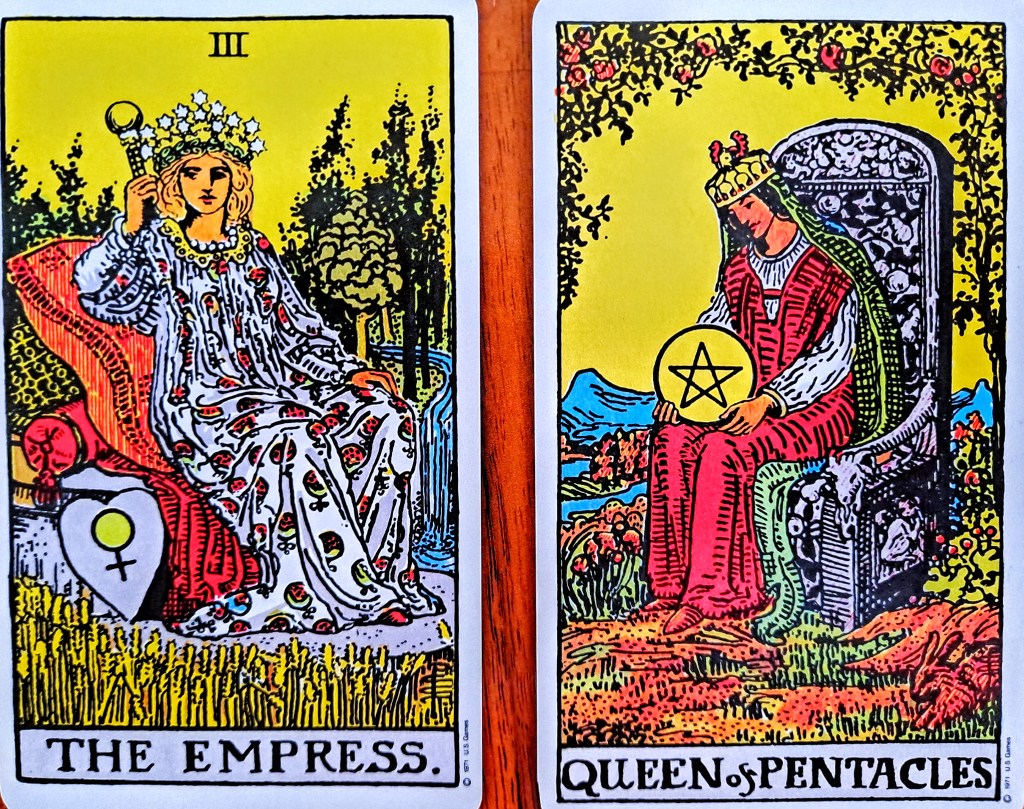 For example, the other day, the cards I dealt out were the Empress and the Queen of Pentacles. As always, the question I ask is “What do I need to know today?” The first card represents my situation, the second the challenge I face.