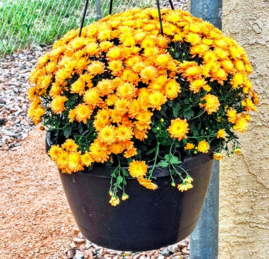 Yesterday was an errand day. A friend and I went to a nearby town to shop for necessities, and since plants are one of my necessities, I bought a chrysanthemum. I stuck the pot in a hanging planter, and will enjoy the color until it’s gone, then I’ll put it in the ground.