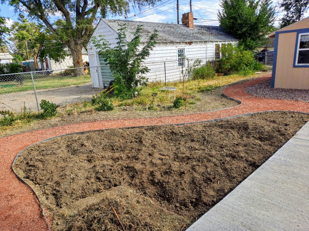 They were disappointed that they weren’t able to complete the job. There is one small area by the back gate still to be filled in, as well as a few more of the edging pieces to be pounded into place, but before they can finish, they need to get more supplies, which is an iffy proposition since the landscaping firm they get it from is only open by appointment in the fall and winter.