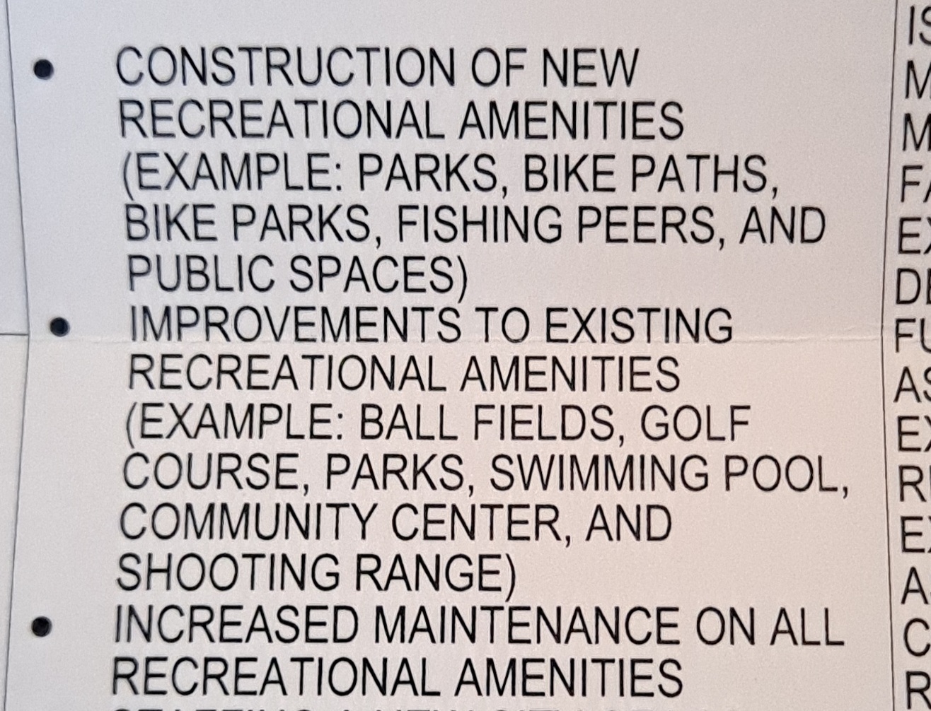 November elections are coming up, and mail-in ballots are being sent out. Locally, the city wants to raise the sales tax to fund recreational activities and improvements throughout town, as laid out in this photo of that part of the ballot: