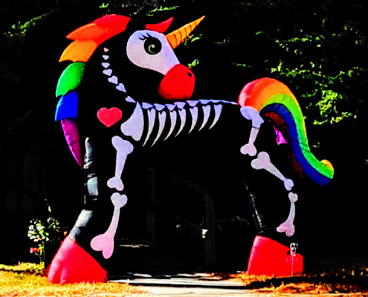 For the first time in my life, though, I saw a Halloween decoration so macabre that it really creeped me out — an 11-foot unicorn skeleton archway in front of a neighbor’s house. Unicorns are linked to such traits as purity, freedom, gentleness, innocence, divinity, magic, fun, positive thoughts, and most of all, life. A dead unicorn seems to be the opposite of all that, though come to think of it, the unicorn looks more like a three-dimensional x-ray than a dead creature.