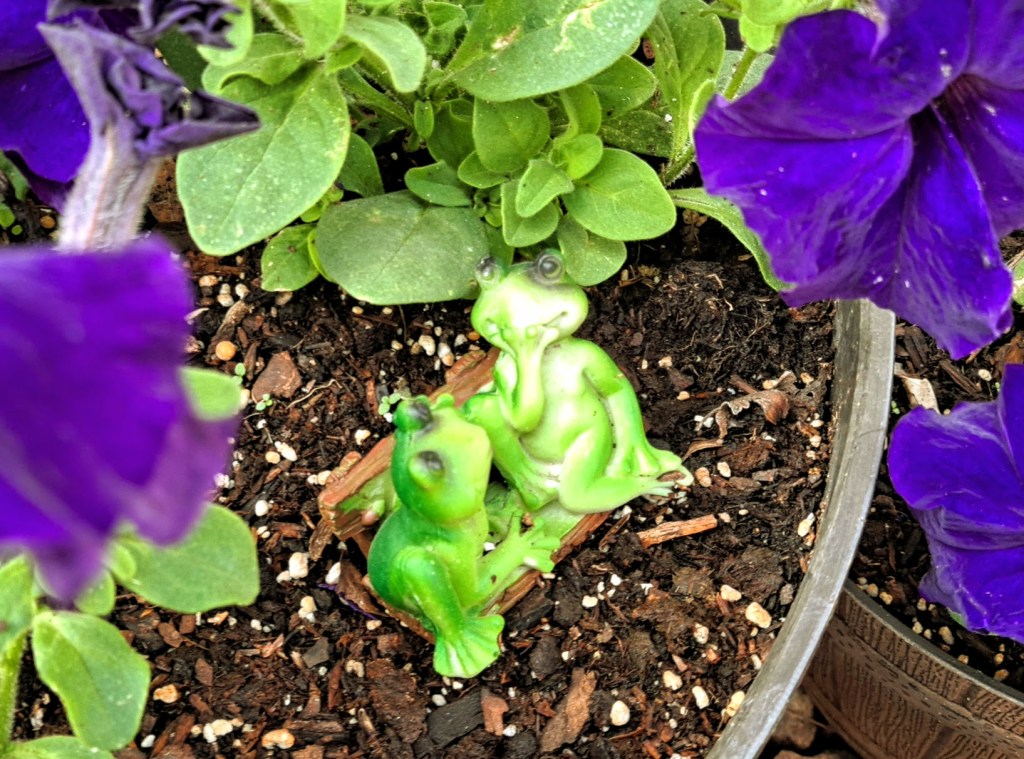 Since there’s nothing new to talk about, I thought I’d post photos of some of my garden whimsies. Ever since seeing my sister’s garden, where she planted broken pieces of pottery among her flowers, I’ve been enamored with the idea of garden decorations. (Though, truly, a garden should be decoration enough!)