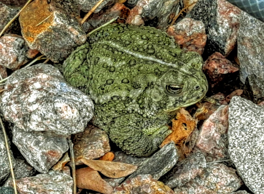 I’ve seen brown toads around here, but this is the first green one I’ve ever encountered. At first I wondered if it were a frog, being green and all, so I looked it up. Turns out all toads are frogs, but not all frogs are toads, and both frogs and toads are signs of a healthy ecosystem, so despite recent setbacks, having this toad hanging around means I’m doing something right. At least, that’s what I tell myself.