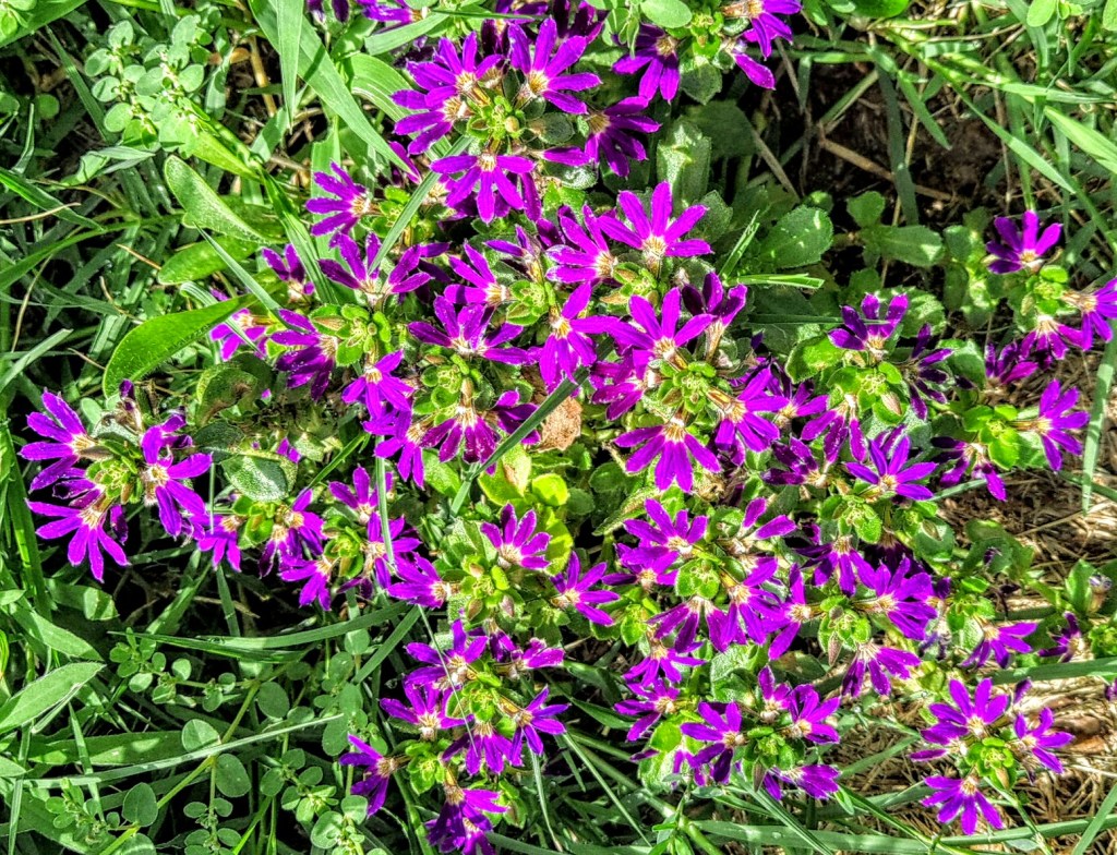I had been wondering about when to mow with all the rainy days we were supposed to have, but today, when the sun came out, I went out and did the chore. I also took photos of flowers, which I’m sure comes as no surprise to you. The dark purple petunia with the pink highlight is one of the petunias that grew itself from last year’s petunias, though those petunias had no pink highlights.
