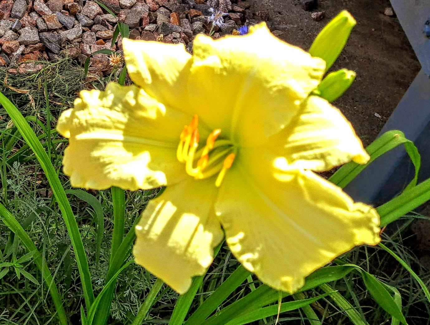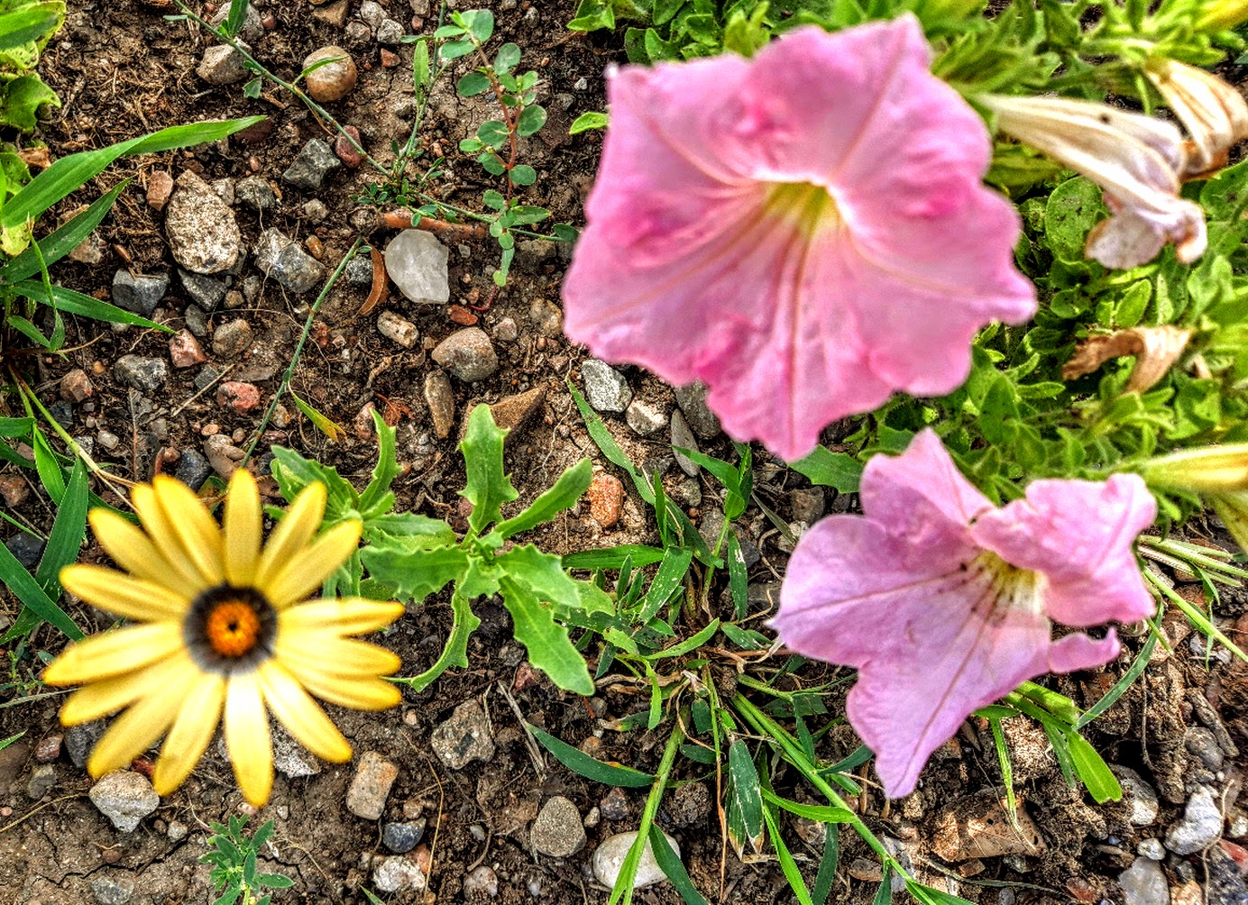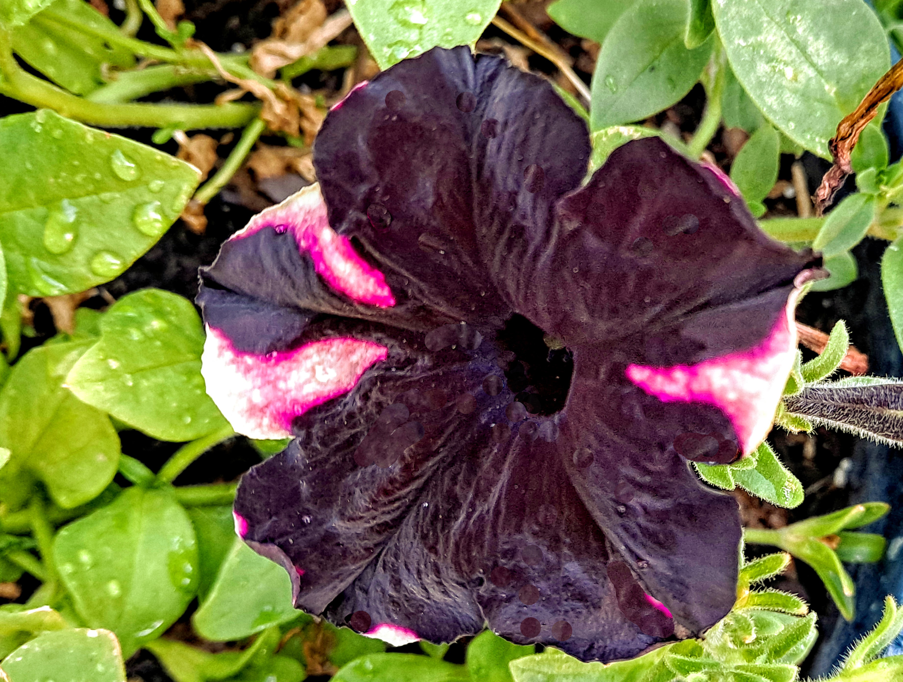 I had been wondering about when to mow with all the rainy days we were supposed to have, but today, when the sun came out, I went out and did the chore. I also took photos of flowers, which I’m sure comes as no surprise to you. The dark purple petunia with the pink highlight is one of the petunias that grew itself from last year’s petunias, though those petunias had no pink highlights.