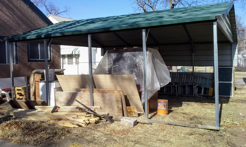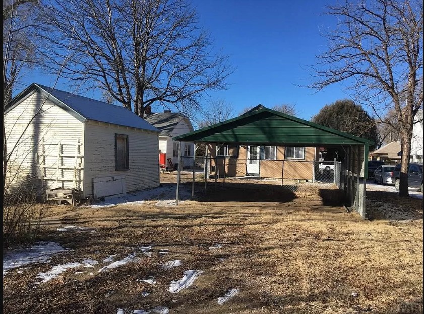 The only photo I have of the original yard is one from the opposite angle, looking toward the house instead of away from it. The old garage is where the raised garden now is, and the new garage is in front of where the carport was, which gives me a rather large yard!