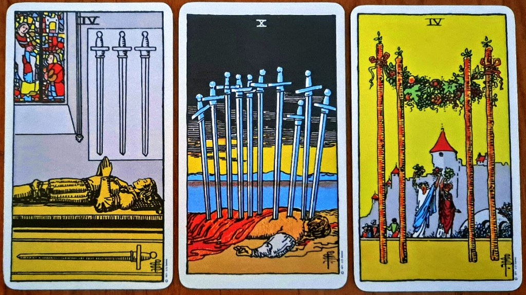 Despite my earlier declaration that the cards generally don’t tell a story, today’s three-card reading did, at least to an extent. The first card, the four of swords tells what happened in the past. (After facing multiple crises, you needed time for solitude and getting ready to face new challenges). The second card, the ten of swords, hints at the results of that past. (Pain, loss, desolation, but in that darkness are the seeds of hope.) The third card, the four of wands, suggests what will happen next or what actions will need to be taken. (Country life, work/life balance, peace, a sense that our projects are a wider expression of who we are.)