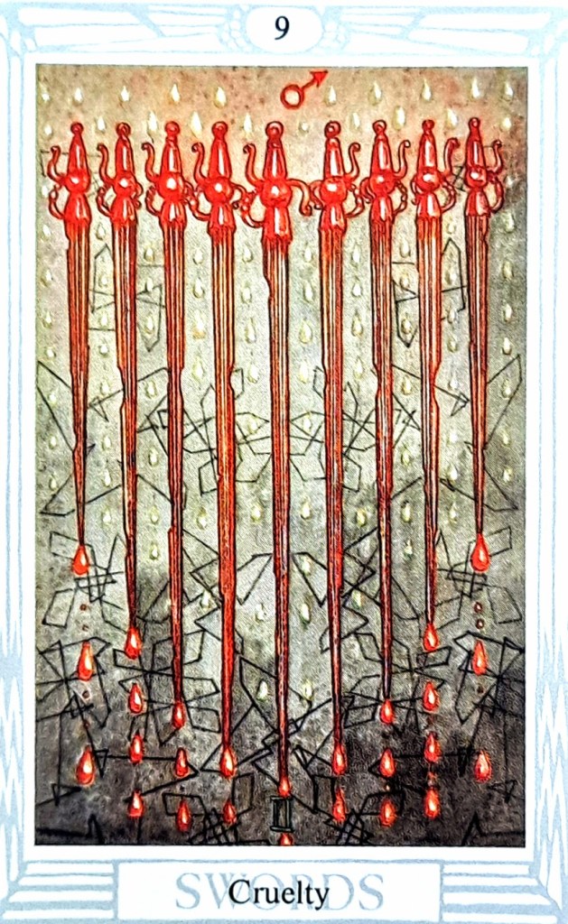 For example, today’s card is the Nine of Swords. It generally means cruelty directed at oneself and points to a tendency to put yourself down. In rare cases, it can mean physical or psychological cruelty by some heartless person, but no one lately is cruel to me. Actually, I’m not cruel to myself, either, though I have recently noticed a tendency to judge myself harshly when (perhaps) I am doing the best I can. Even if I’m not doing the best I can, that judgment call seems to be worse than whatever goals I breeched.