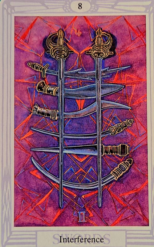 This inner conflict was in the back of my mind when I picked yesterday’s card — the eight of swords. The Mirror of the Soul cautions, “You will not be able to come to a decision analytically. Your doubt, or fears of making the wrong choice, constantly destroys your inner clarity. No matter where you turn, no satisfactory solution seems to exist. The more you try to untangle the ball of yarn, the tighter the knots become.” The Mirror of the Soul goes on to offer this solution to the conundrum: “Relax and let things develop on their own. The problem which seems unsolvable now will find its own solution in its own way.”