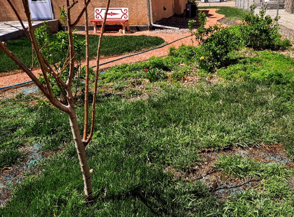 I fretted about the lawn, not sure what to do about the grass that died, but since I often find myself standing at the back window looking out at the shimmering emerald of the lawn in front of the bench and feeling calm settle over me, I decided it was worth keeping up with the lawn as a mental health aid, if nothing else. At the worst, I’ll have to replant some of it every year for a while as well as digging up the invading Bermuda grass, but you never know — this seed might be as heat tolerant as it claims to be. Still, the sun in this corner of Colorado can be fierce, made even more searing by low humidity and high winds, so I won’t blame the grass if it has a hard time establishing itself along the path where it gets no shade. Oddly, even the plants that supposedly need to be grown in full sun do better around here with a bit of shade, perhaps because the shade keeps the moisture in the soil a bit longer.