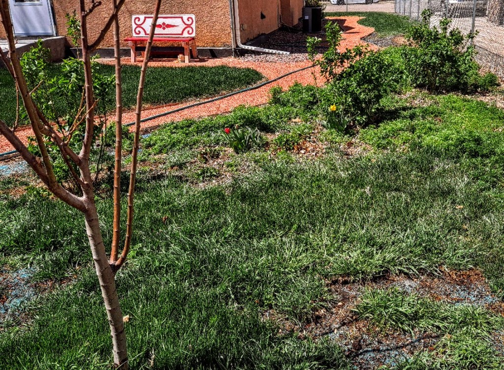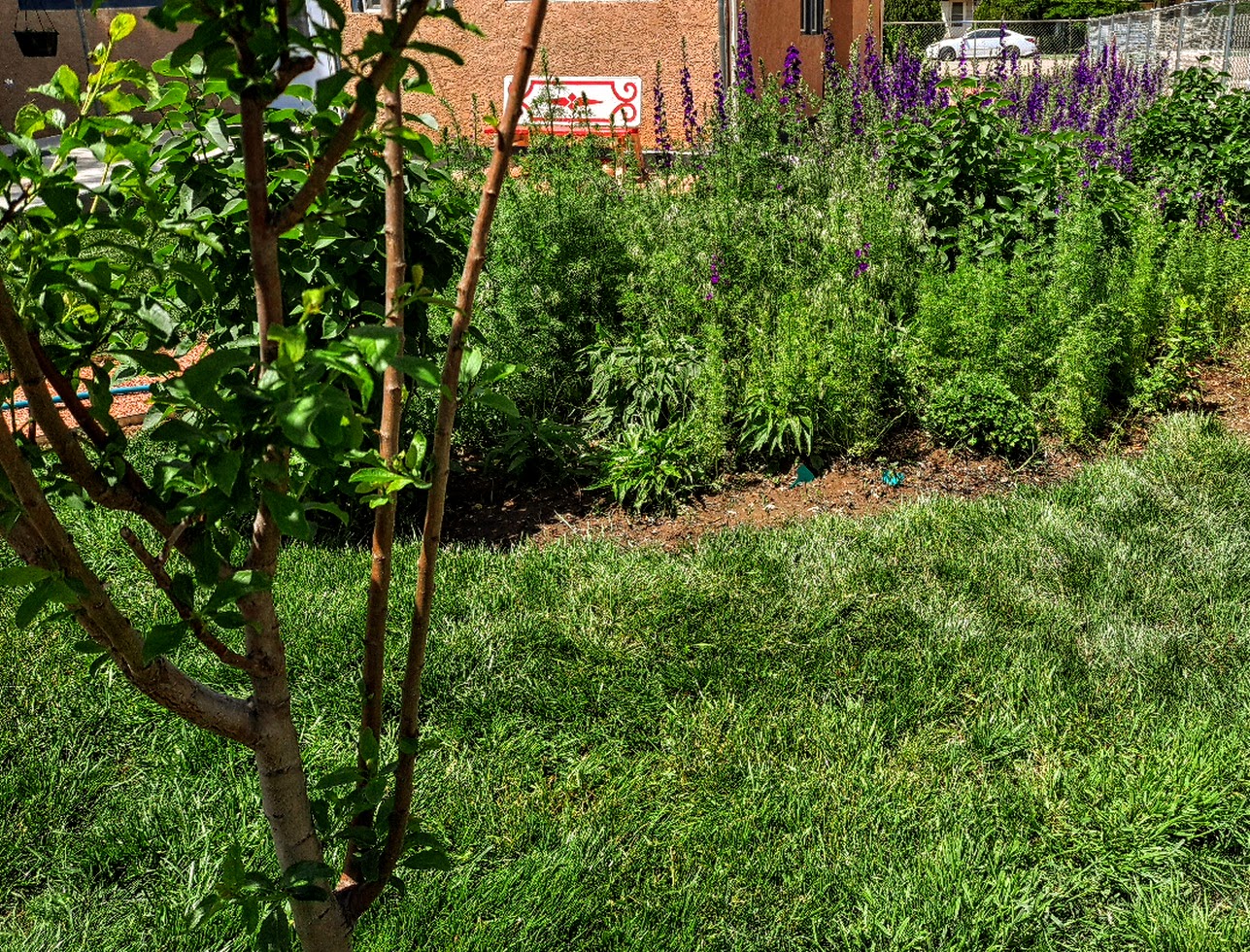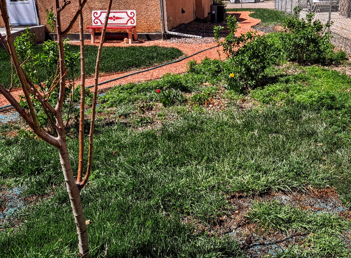 A month later, things are completely different. As you can see from the following photo, many of the grass seeds took hold, and grass has greened up nicely. The tree has leafed out. The lilacs grew more in the past month than they have the past couple of years. And the larkspur have pretty much invaded not just along the path where the grass died, but the whole rest of the garden, too. I had to wade through the larkspur to find some of the plants I put in last fall, such as lilies and chrysanthemums, and clear a space around them to give them room to grow.