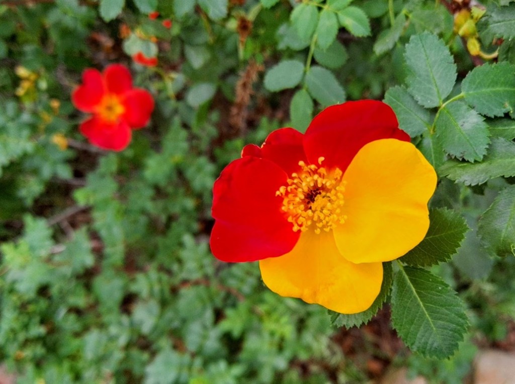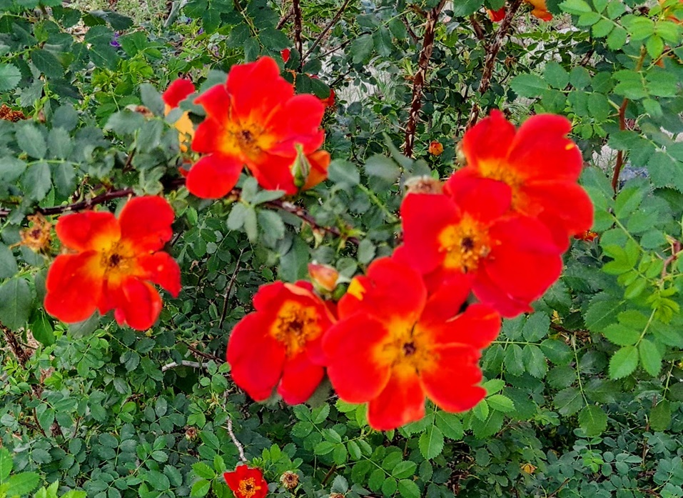 I have always loved the look of red and yellow bushes mixed together, but my yellow and red bushes got separated. I’ve been trying to buy yellow roses to plant among the red, but never found any. I have come to believe that the yellow is an aberration. One of my red bushes ended up with a stem of yellow flowers. I also found some yellow flowers on a red branch. And in one case, the red rose had yellow petals, too.