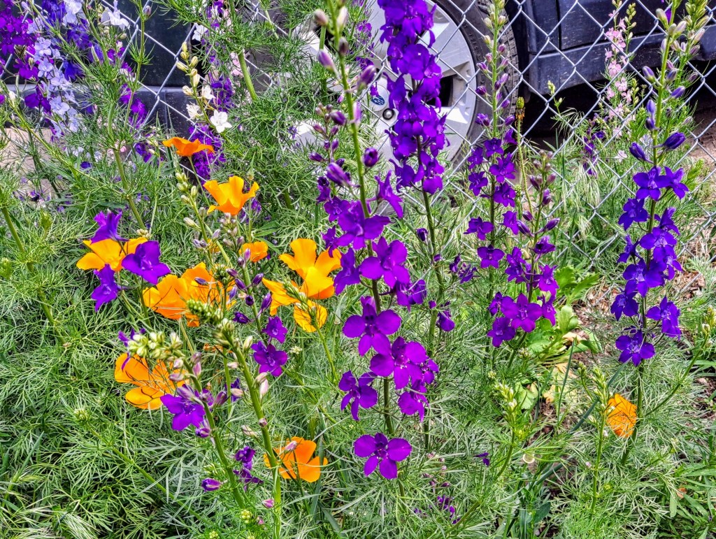 Even though I thought I’d harvested all the larkspur seeds last year, enough blew around that any weedy area became a larkspur field this year.