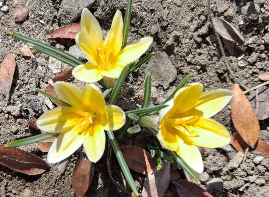 Love your crocuses! I discovered a few here earlier this week, too. Only one is yellow; the rest seem to be various shades of purple. Some are in the garden beds but others are growing in the lawn and in the gravel yard. There aren’t many but they are so cheery, and a welcome reminder that spring is coming–less than three weeks from now. Yay!