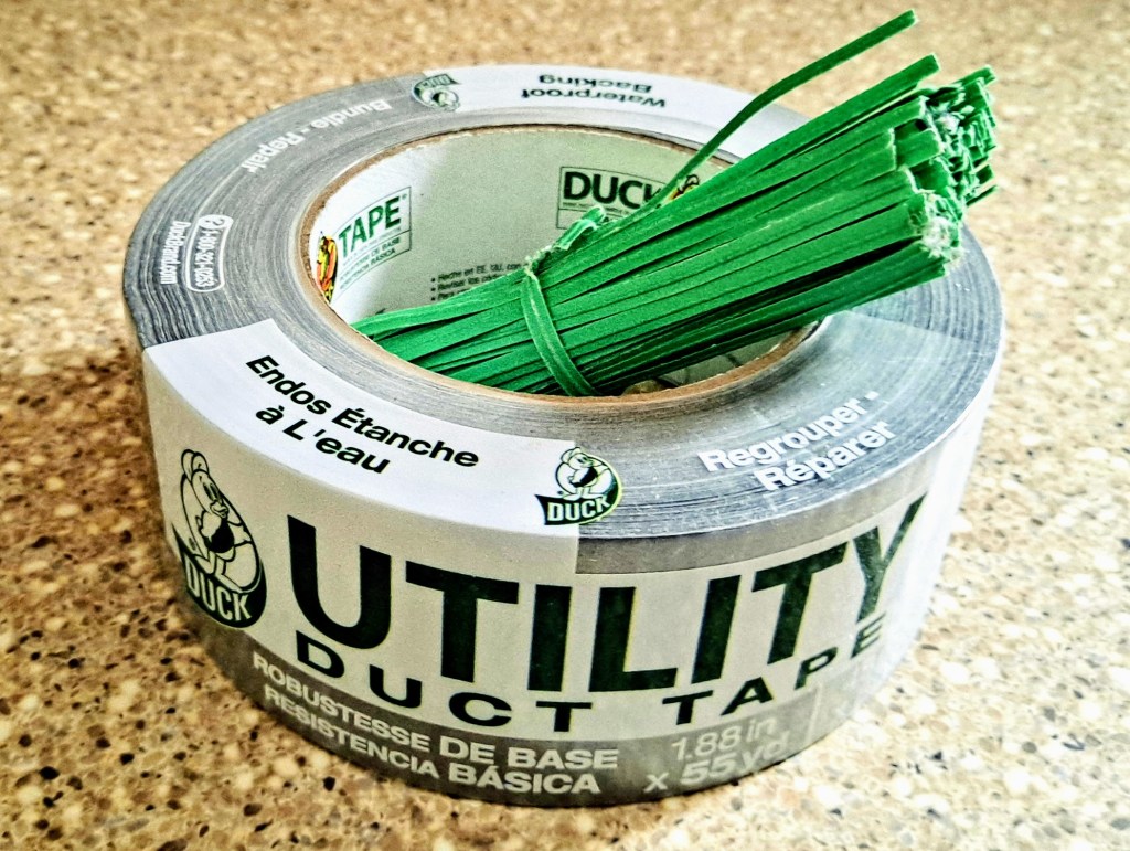 I am using the name “duct tape” here, which is supposedly the correct term, though one use for duct tape that is not recommended is sealing ducts since the adhesive can come loose with heat. The name by all rights should be “duck tape” since the original cloth-backed tape was made with duck fabric — a heavy-duty cotton cloth. Either way, duct tape or duck tape, that ubiquitous product has many uses. People used it in crafts so often that now it comes in a multitude of colors or patterns. But I stick with the gray. It’s easy to use and so cheap I can keep one roll in the house and one in the garage.
