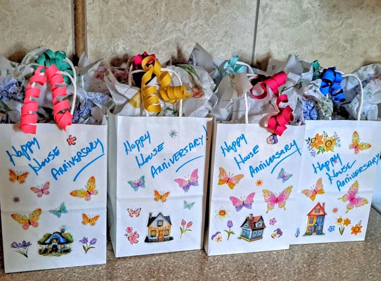 The house anniversary is one of the few dates in my life I like to celebrate, and so does my next-door neighbor. (Apparently, I was an answer to her prayer for a good neighbor. Makes me feel special since I’ve never — to my knowledge — been the answer to anyone’s prayers.) To honor the occasion, she gave me these gorgeous roses!