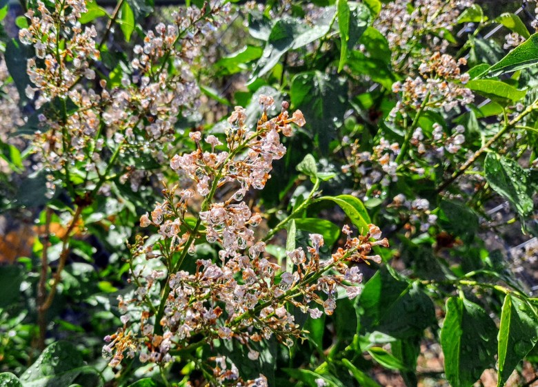 Another photo I took doesn’t do justice to what I wanted to memorialize. I’d just finished watering the lilac bushes when I noticed water drops clinging to the denuded flower stems. In the morning sun, those long-past-their-prime lilacs glittered like crystal. It was an awesome sight!