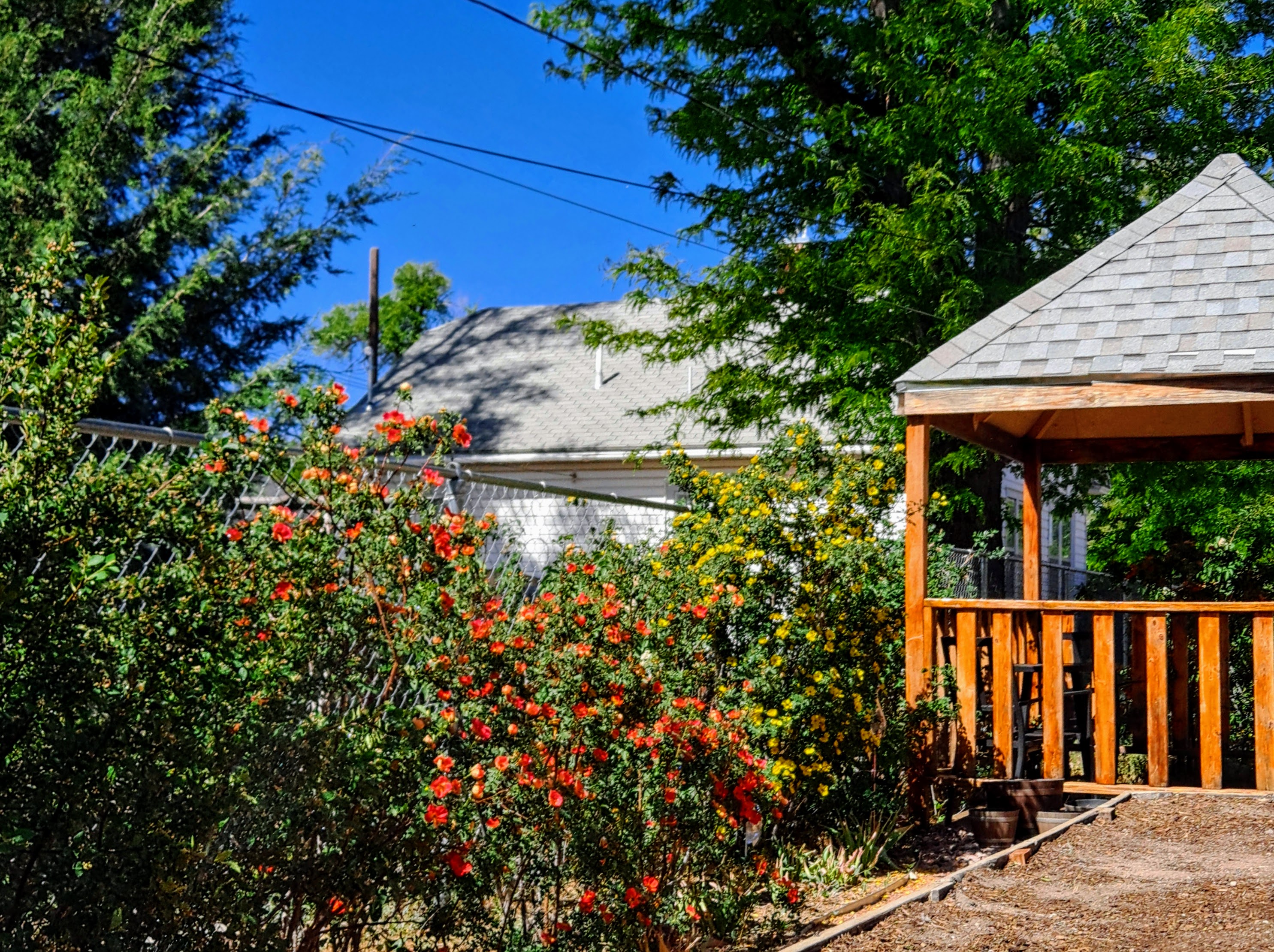 This last photo was a surprise. I must have pushed the button as I was walking away from those lilacs toward my gazebo, because this photo showed up on my phone. I loved the colors, especially the blue of the sky, so I kept it. (In the interest of honesty, I have to admit I skewed the photo from the original slanted image to get this version, but otherwise, the phone did it all on its own.)